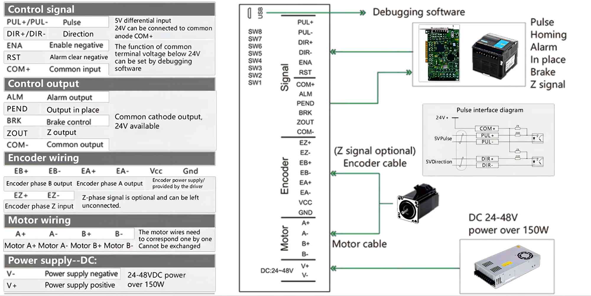 SCT60PLUS stepper servo driver has the input and output functions of the encoder Z signal,and the Z signal homing function is integrated (input start homing signal, the driver automatically completes the Z signal return to the origin)T60PLUS driver integrates M-USB communication port, which is convenient for debugging related parameters.